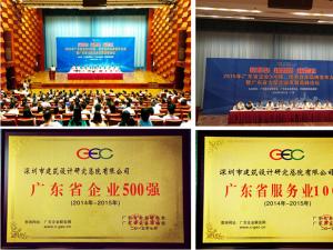 7月31日,由廣東省企業聯合會、廣東省企業家協會主辦的“2015年廣東省企業500強、優秀自主品牌發布會” 在廣州白云國際會議中心廣東大會堂隆重召開,深圳市建筑設計研究總院有限公司榮獲“2015年廣東省企業500強,廣東省服務業100強”榮譽稱號..